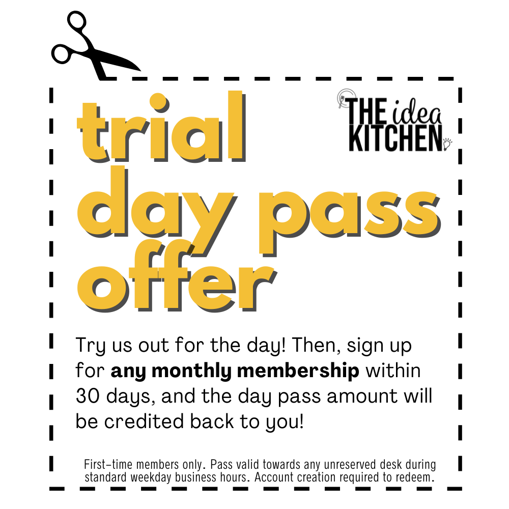 Create an account and purchase a “desk for a day” pass for future use. Then, sign up for any monthly plan within 30 days and we’ll credit you back the cost of the pass!